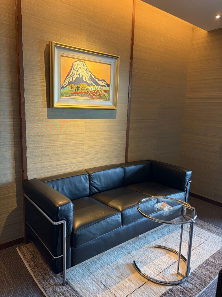 壁に掛けられた富士山のアート、重厚感のあるソファ、無駄を削ぎ落とした家具。