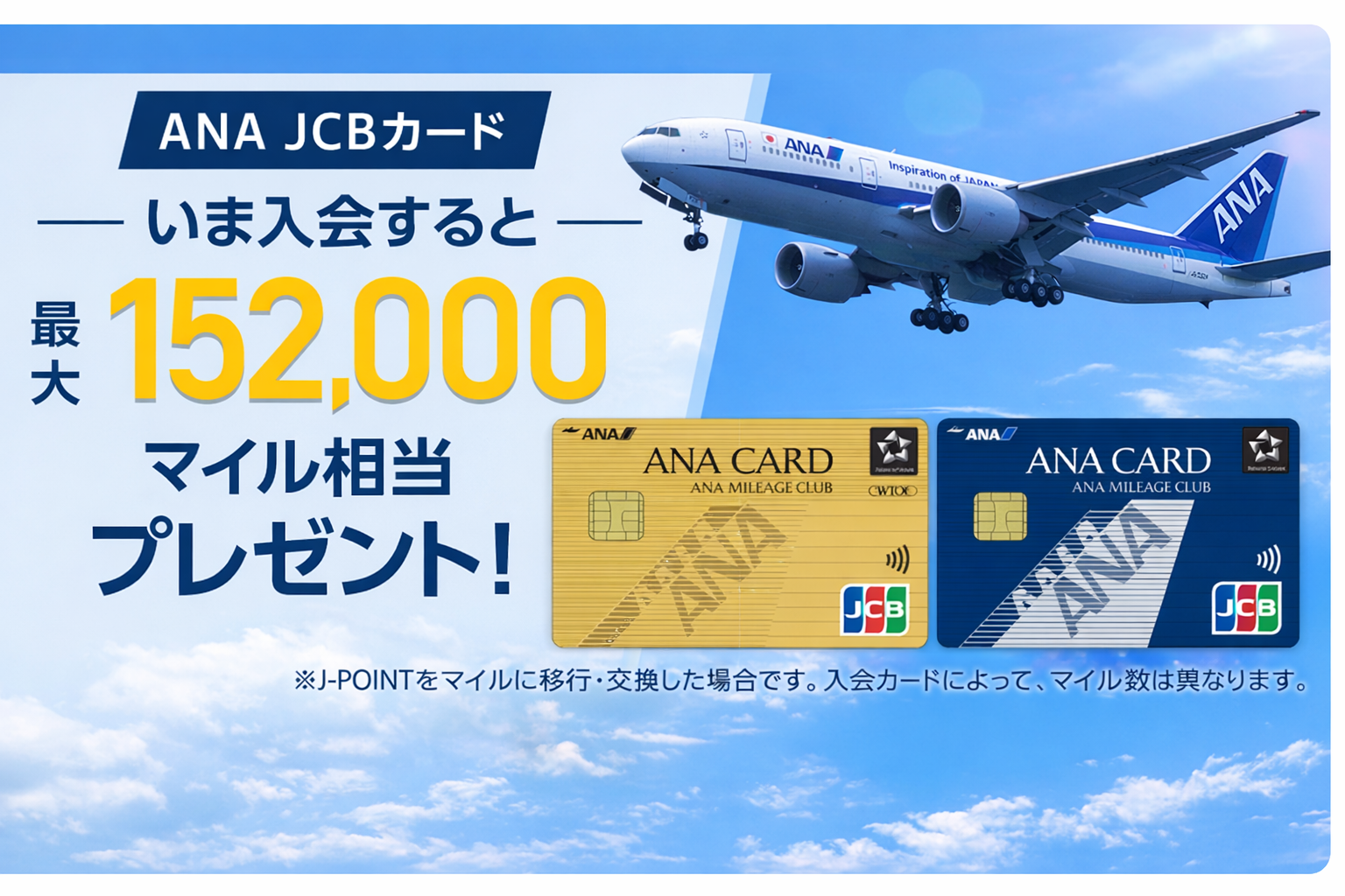 今、ANAJCBカードでは、対象カードに新規入会して各種条件を達成すると最大152,000マイル相当プレゼントキャンペーンを行っているようです。我が家も参加したい…!